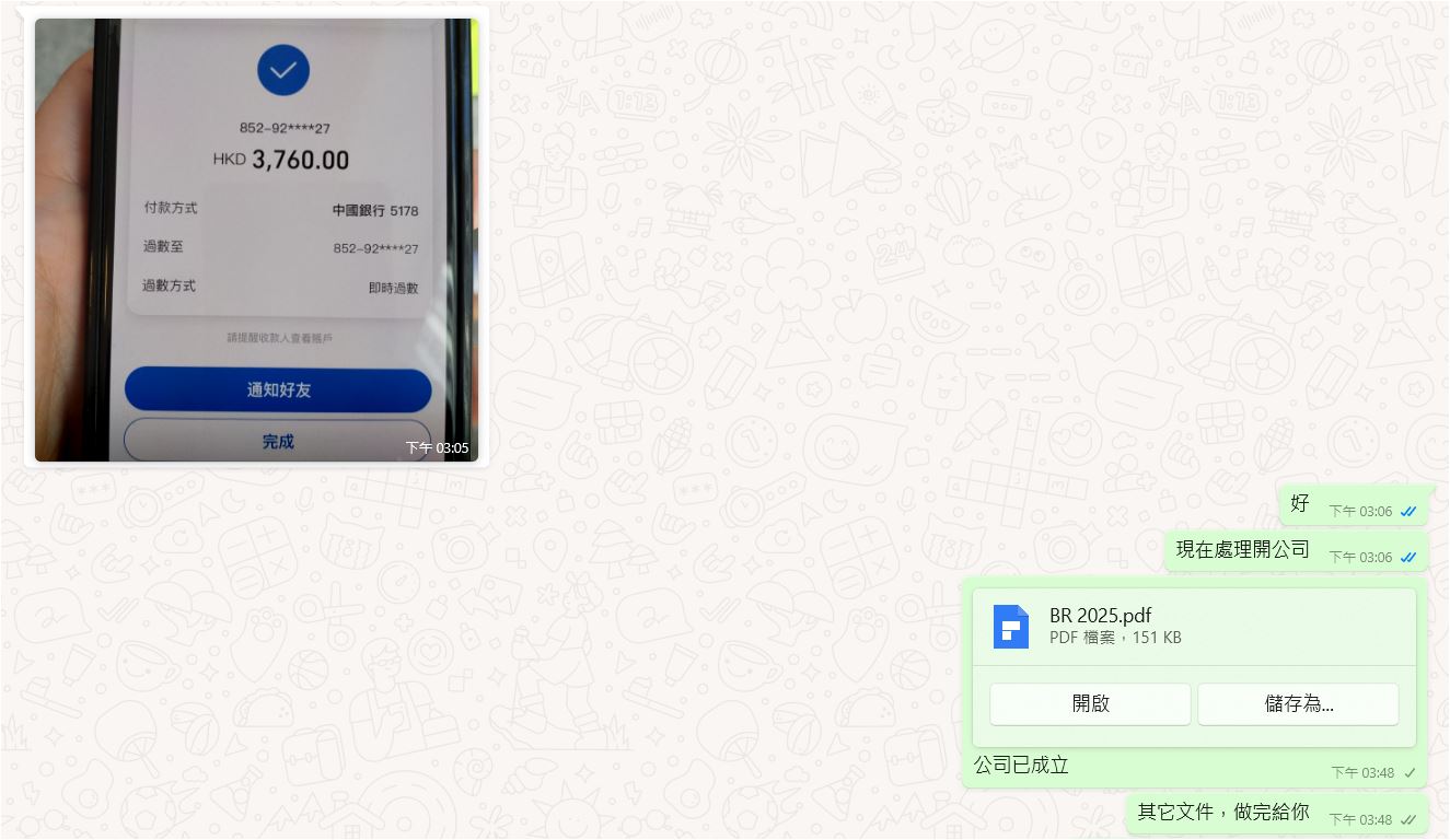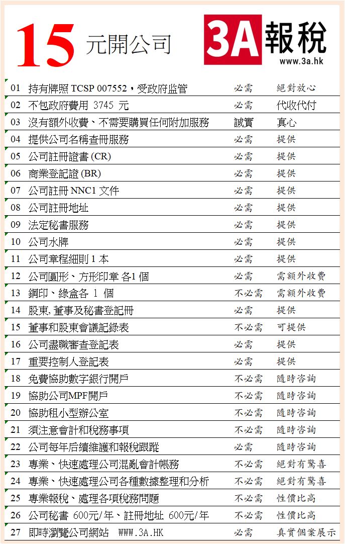 政府費用:一年商業登記證BR 2,200+公司注冊證CI 1,545 = 3,745元